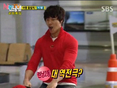 ↑ の黒いかばんは移民かばんと呼ぶらしいです。グァンス君が入れるくらいですから、とっても大きいことは確かでしょうね。底にキャスターがついていて転がせます。そこに着目した芋虫競争みたいなゲームです。引き手と引っ張られる側の呼吸がうまくあわないと、ぐらついたり転んだりします。JKは最初のうちもたもとして、ジホさんチームに一周差をつけられてます。ところが!